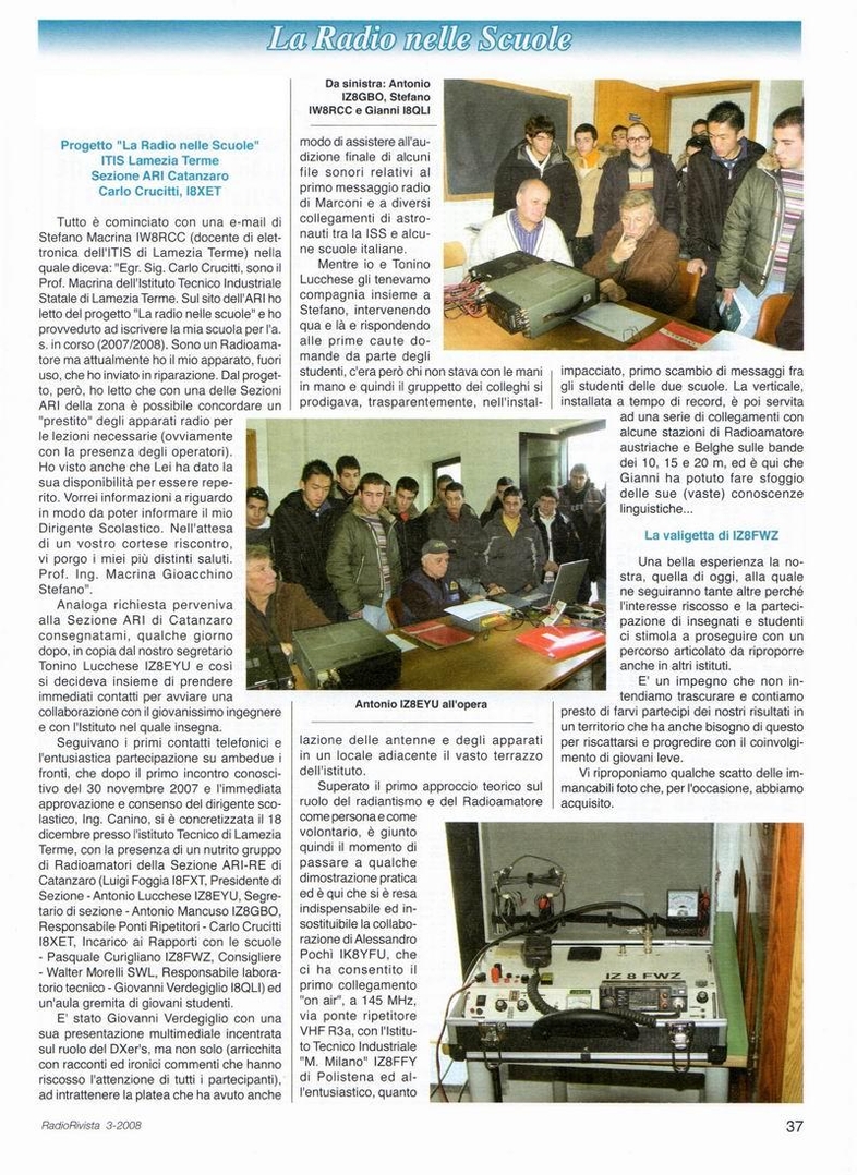 A seguito di un protocollo d'intesa stipulato tra la Sezione ARI di Catanzaro e l'ITIS di Lamezia Terme, e grazie alla collaborazione dell'Ingegner Stefano Macrina, professore presso l'istituto e radioamatore (IW8RCC), alcuni soci, coordinati da Carlo Crucitti (I8XET) referente locale del progetto "La radio nelle scuole", hanno partecipato ad alcune giornate dimostrative per illustrare il progetto e far vivere aglu studenti l'emozione dei collegamenti via radio.